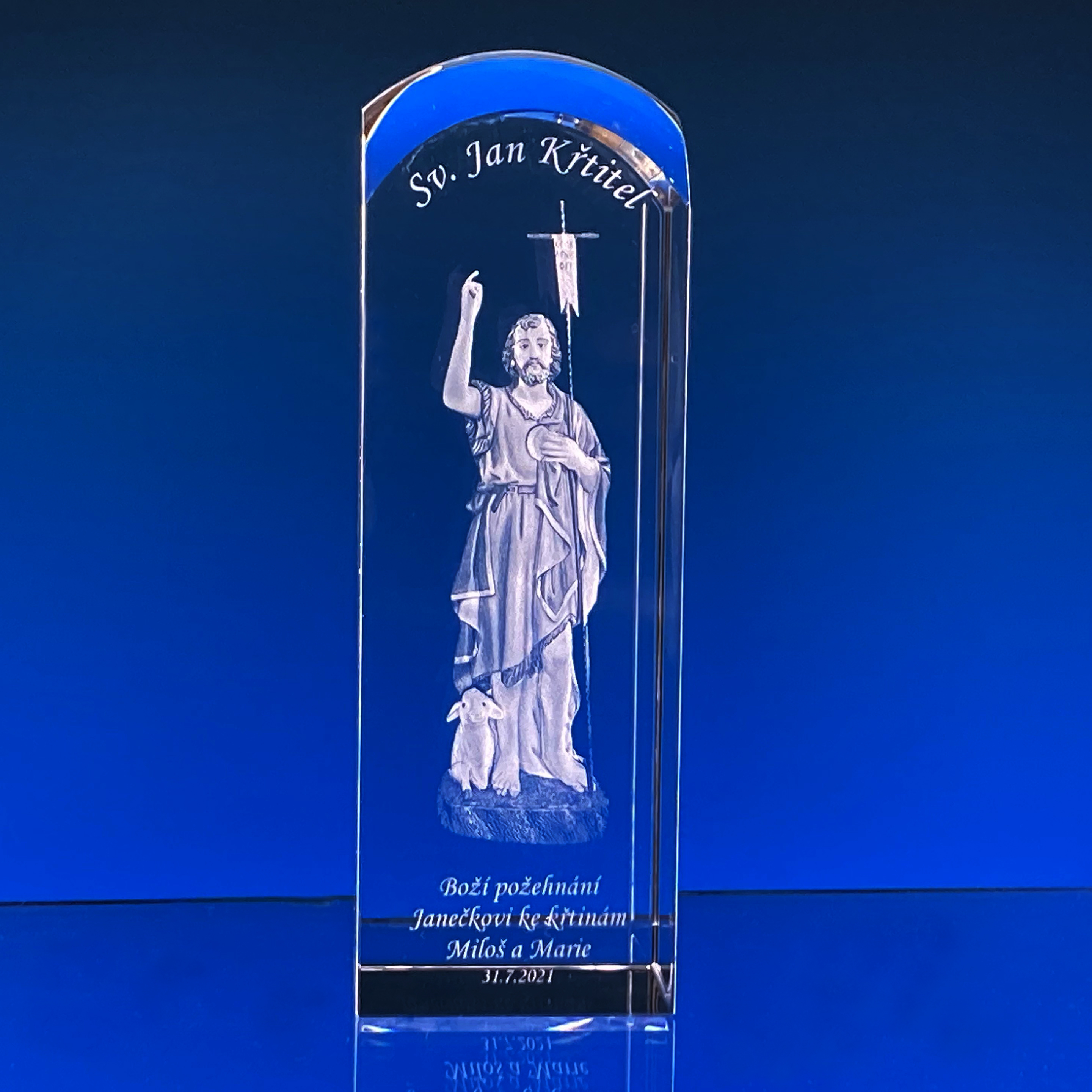 CENA obsahuje: 1x skleněné těžítko s vylaserovaným 3D motivem JANA KŘTITELE, laser 2D textů na přání a dárkovou krabičku