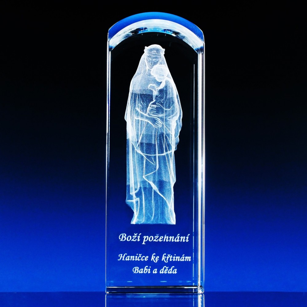 CENA obsahuje: 1x skleněné těžítko s vylaserovaným 3D motivem PANNY MARIE, laser 2D textů na přání a dárkovou krabičku