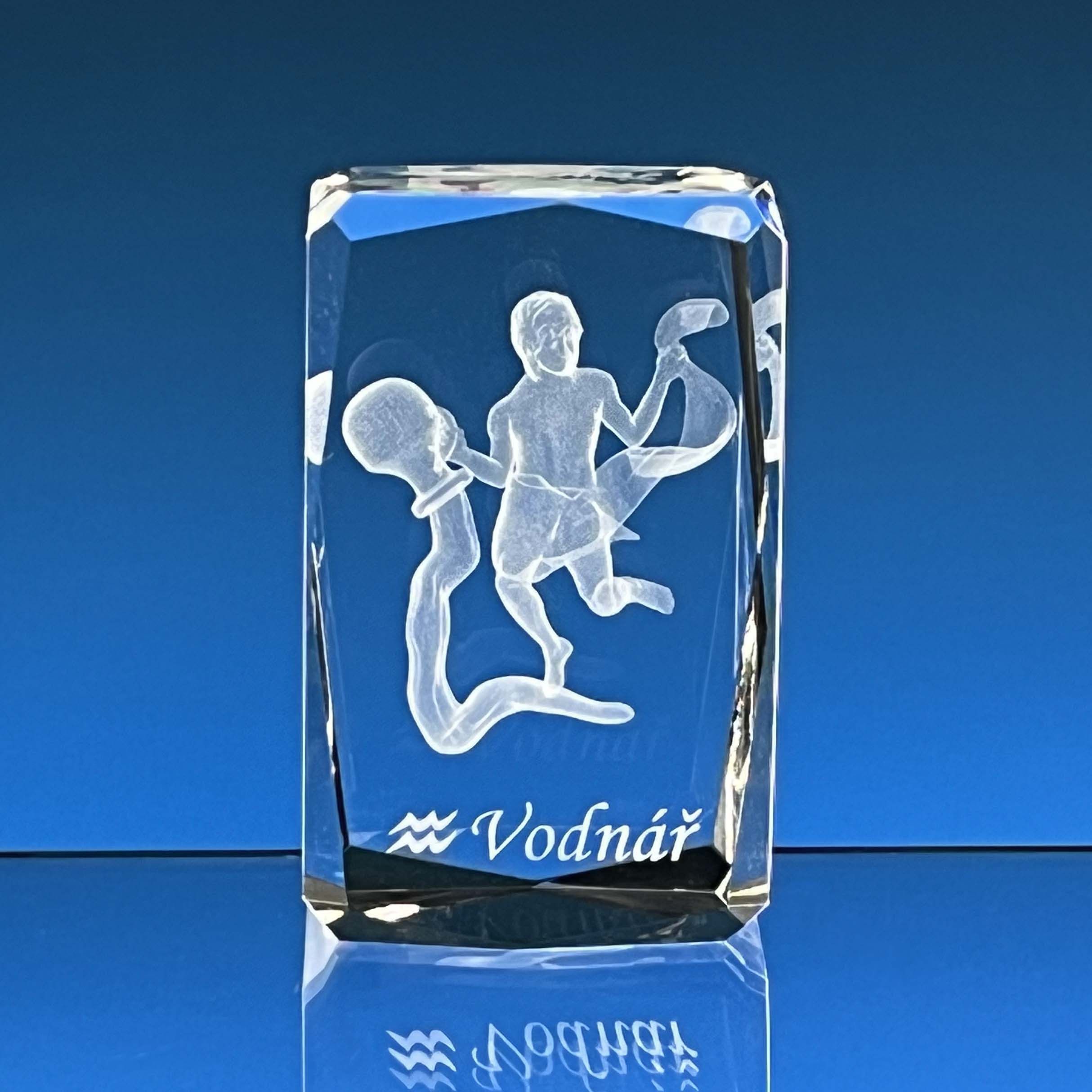 CENA obsahuje: 1x skleněné těžítko s laserovaným 3D motivem VODNÁŘ, laser 2D textů na přání a dárkovou krabičku